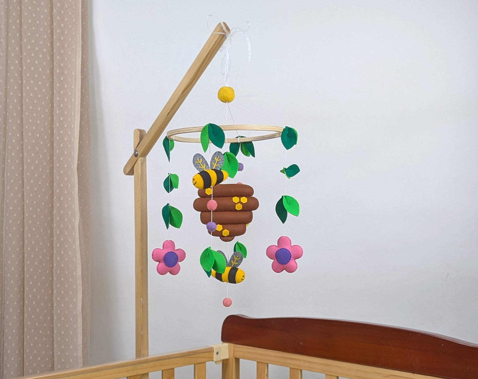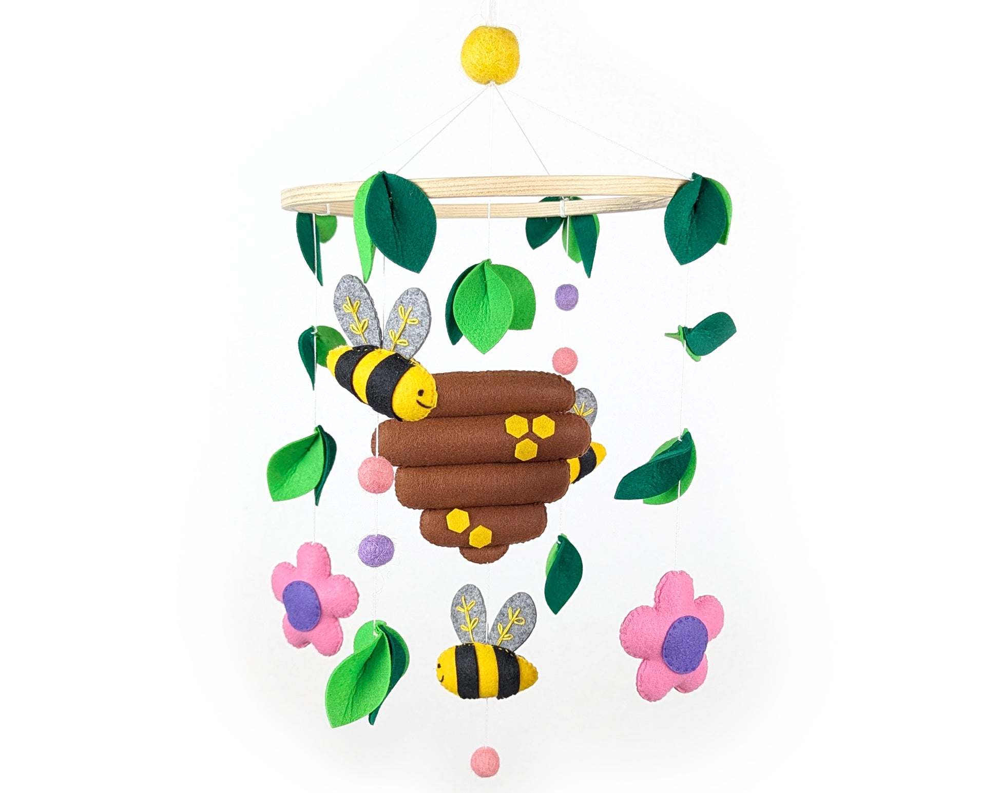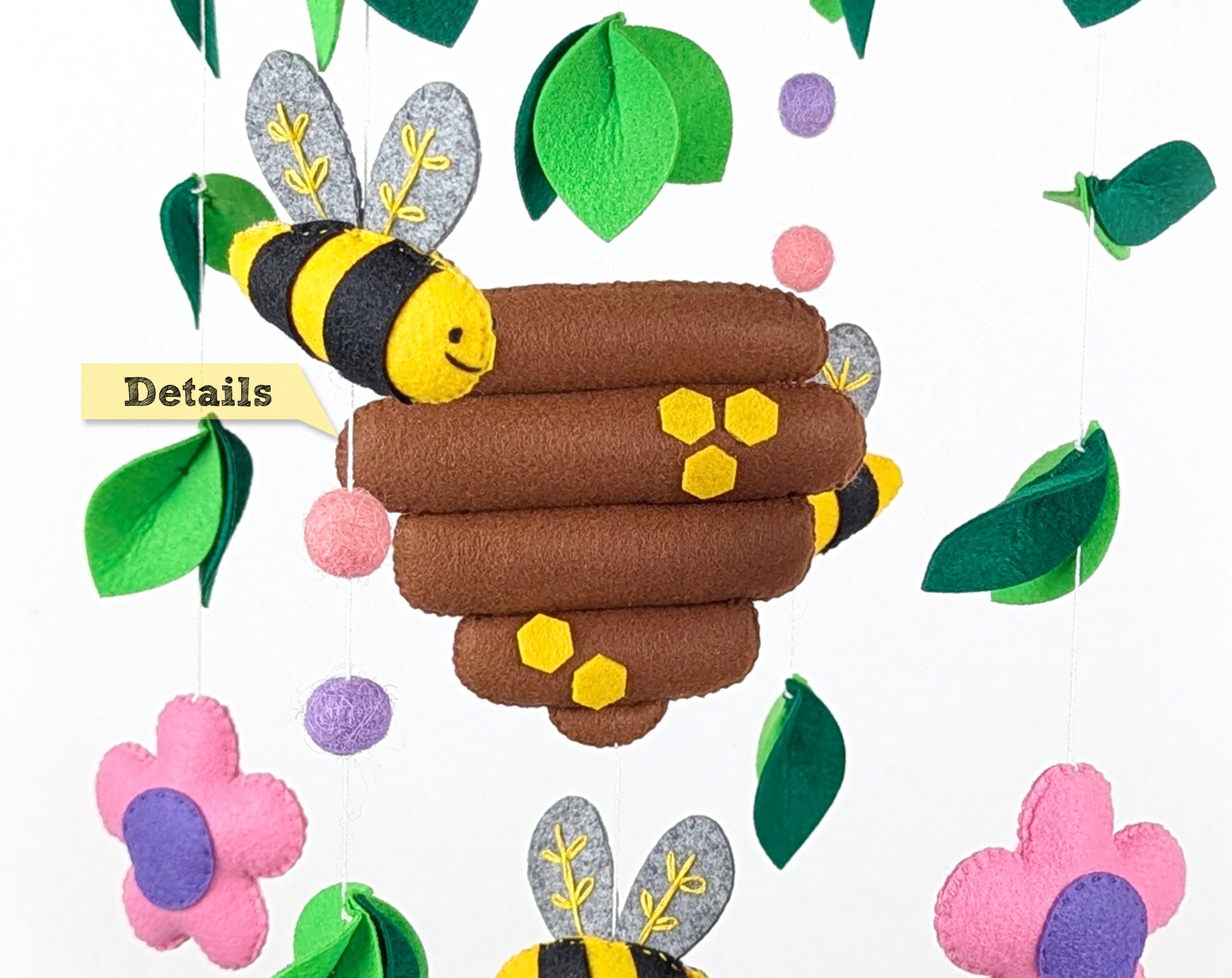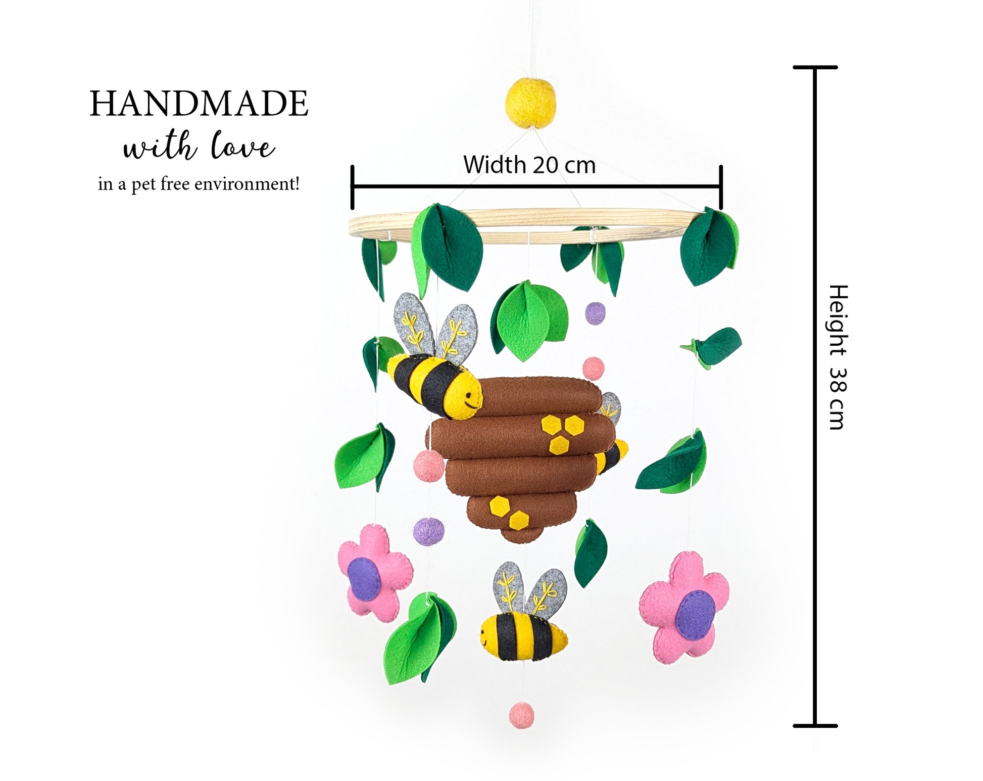 This listing is for one handmade plush Honey Bees Cot Mobile. (Wall hook/crib arm not included). This Baby Mobile includes 3 Honey Bees Bumble Bees, 1 Beehive, 2 Flowers and multiple leaves. Unleash your child's imagination and keep them busy for hours as they explore our one of a kind, handcrafted felt plush Ornaments, Wall Hangings, Garlands and Baby Mobiles. Each plush stuffed element is lovingly hand cut and hand-switched in a pet-free environment. Then it is filled with hypo-allergenic polyester stuffing and hung from a ribbon. Made with premium quality felt fabric, it is extremely safe to your baby's touch. Materials: felt, pinewood stand, wooden beads, cord, polyester stuffing, embroidery thread and lots of love. Kindly Note: Colors depicted on your screen may be slightly different from the actual product. While we try to accurately display the colors of all our products, the colors you see will depend on your monitor and may not be accurate because of the variations in electronic screen settings (computer/laptop/tablet/smartphones).