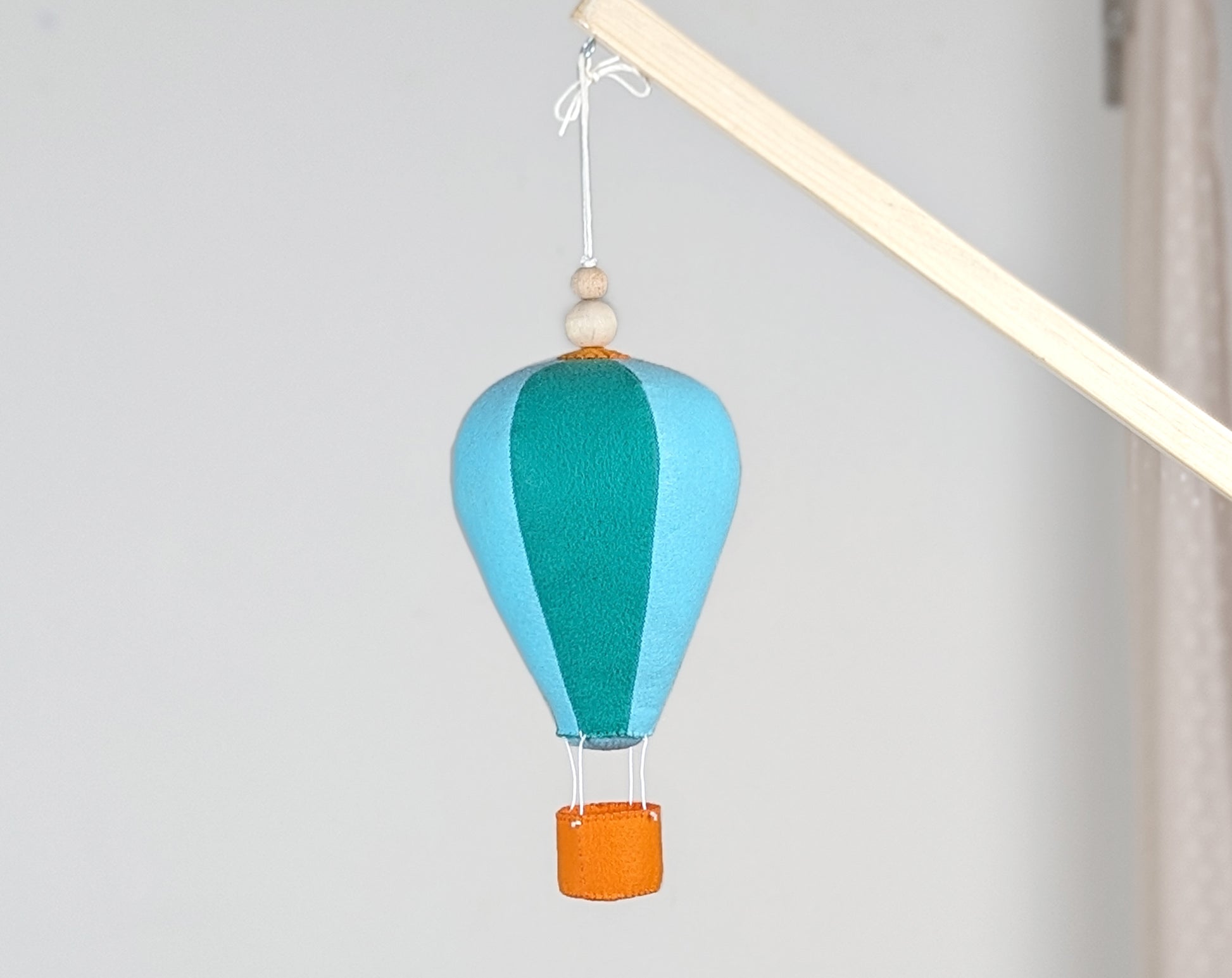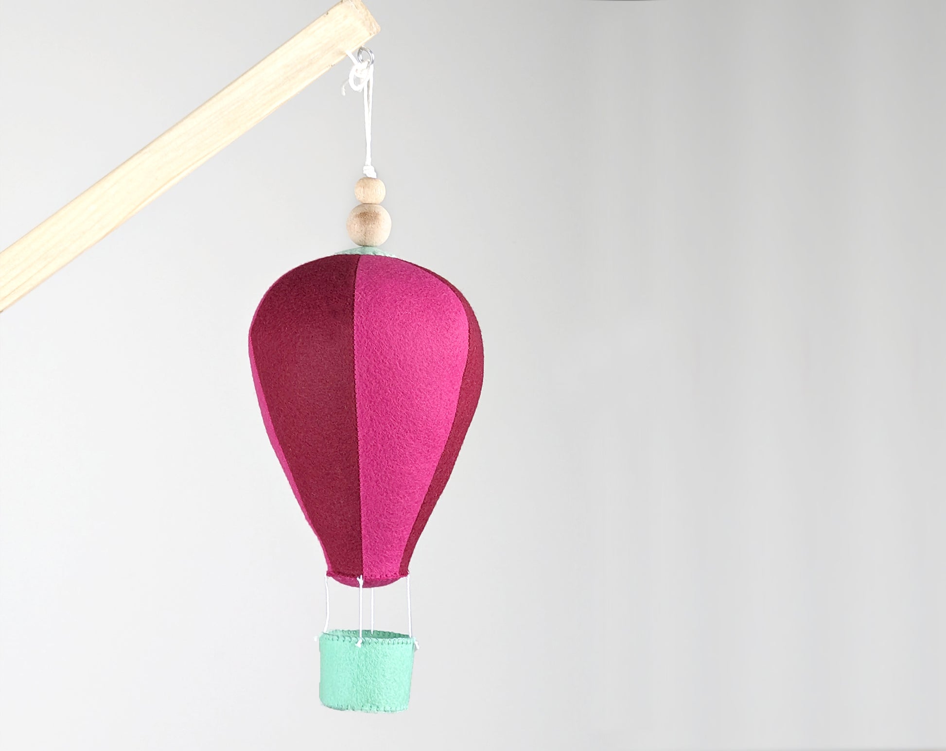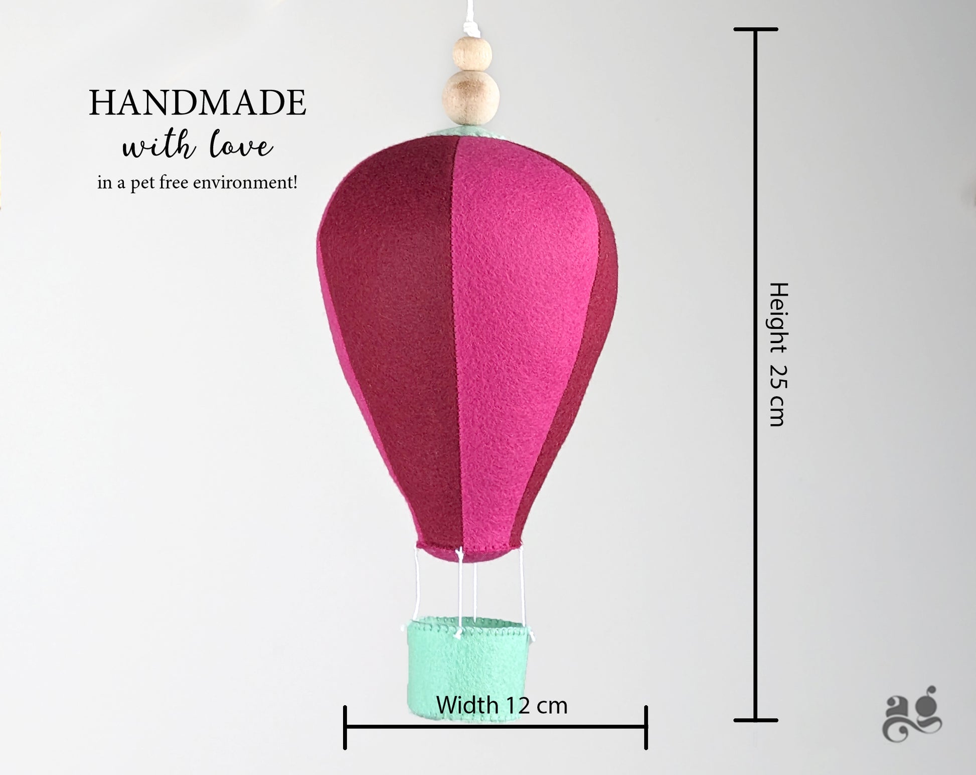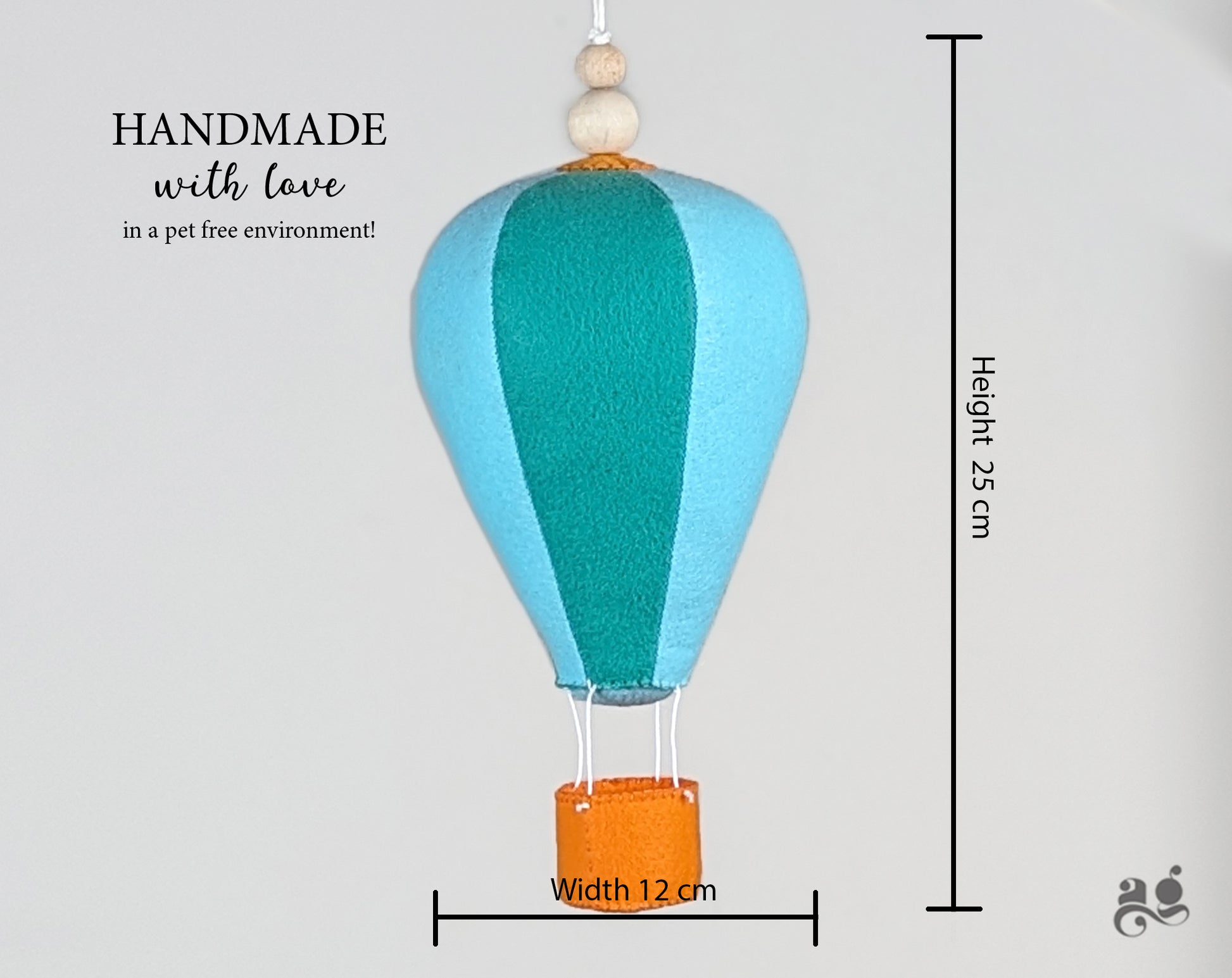 This listing is for one handmade plush Hanging Hotair Balloon ornament hanging from a cord. (Wall hook not included). Hang this Hotair balloon with pride and enliven your kid's bedroom or play area. Unleash your child's imagination and keep them busy for hours as they explore our one of a kind, handcrafted felt plush Ornaments, Wall Hangings, Garlands and Baby Mobiles. Each plush stuffed element is lovingly hand cut and hand-switched in a pet-free environment. Then it is filled with hypo-allergenic polyester stuffing and hung from a cord.