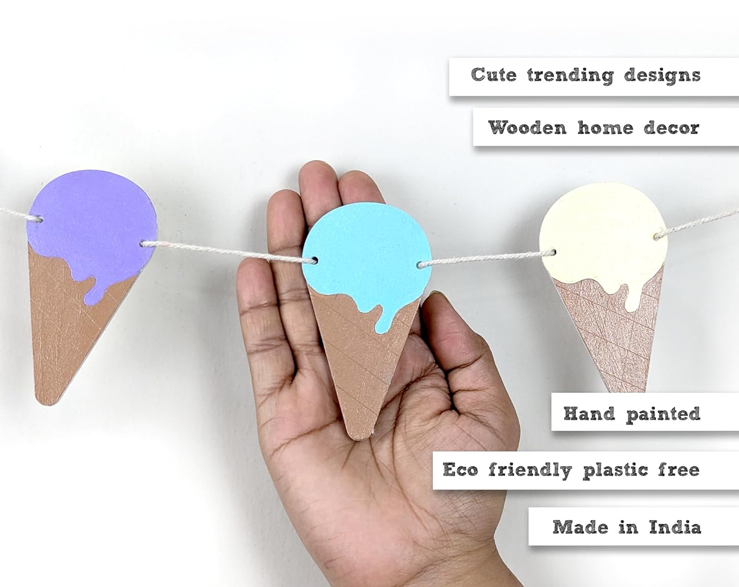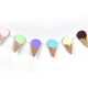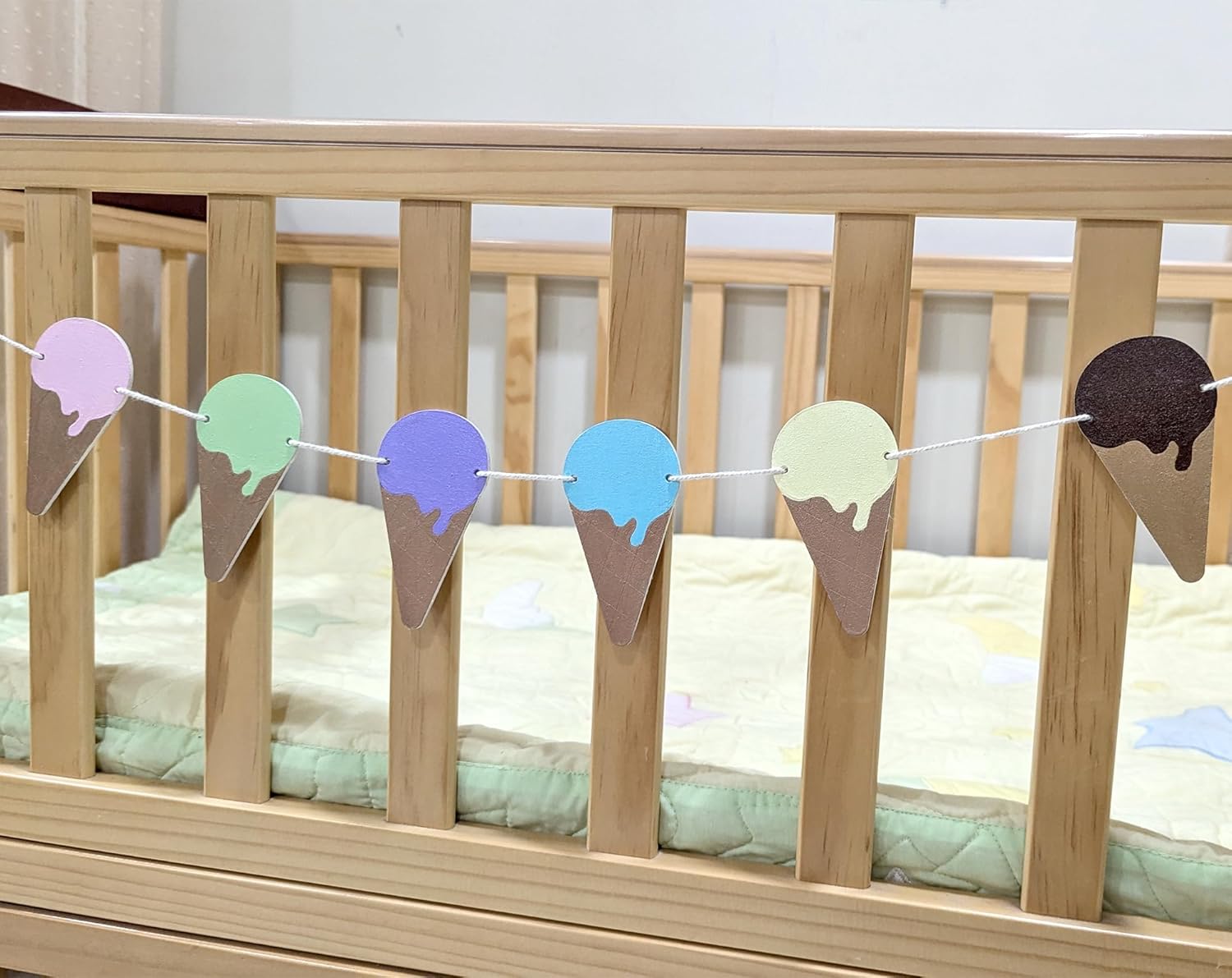 - Package Includes: Charming ice cream cone shaped bunting with 6 cones in pastel colours (pink, mint, purple, blue, yellow, chocolate) connected by a sturdy cord
