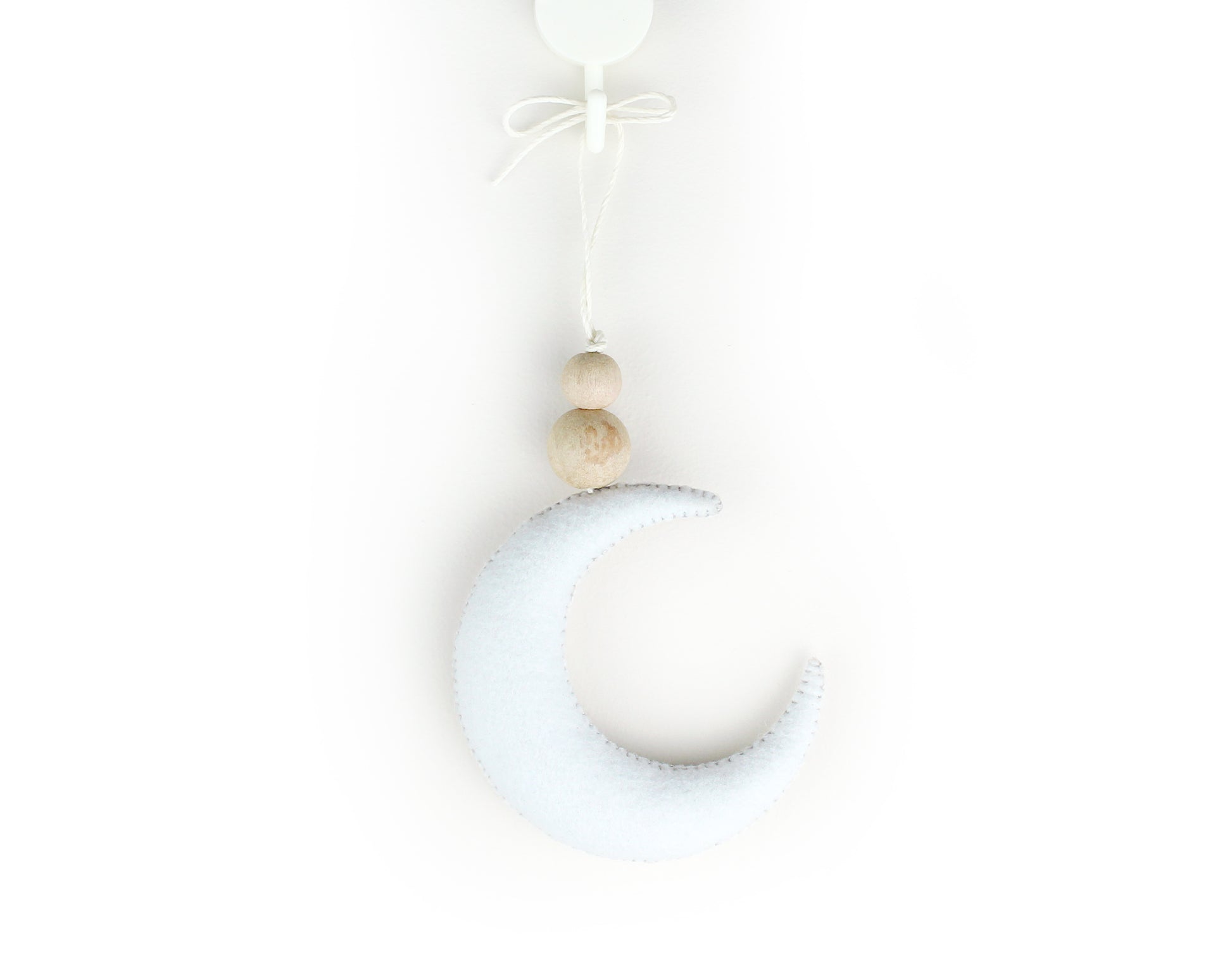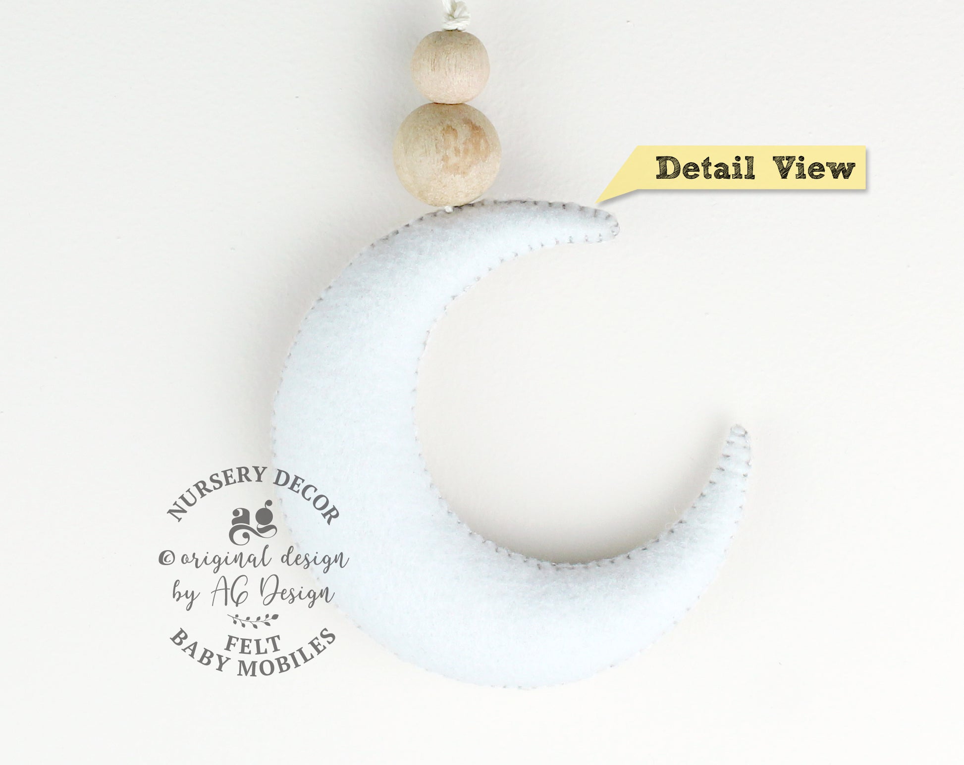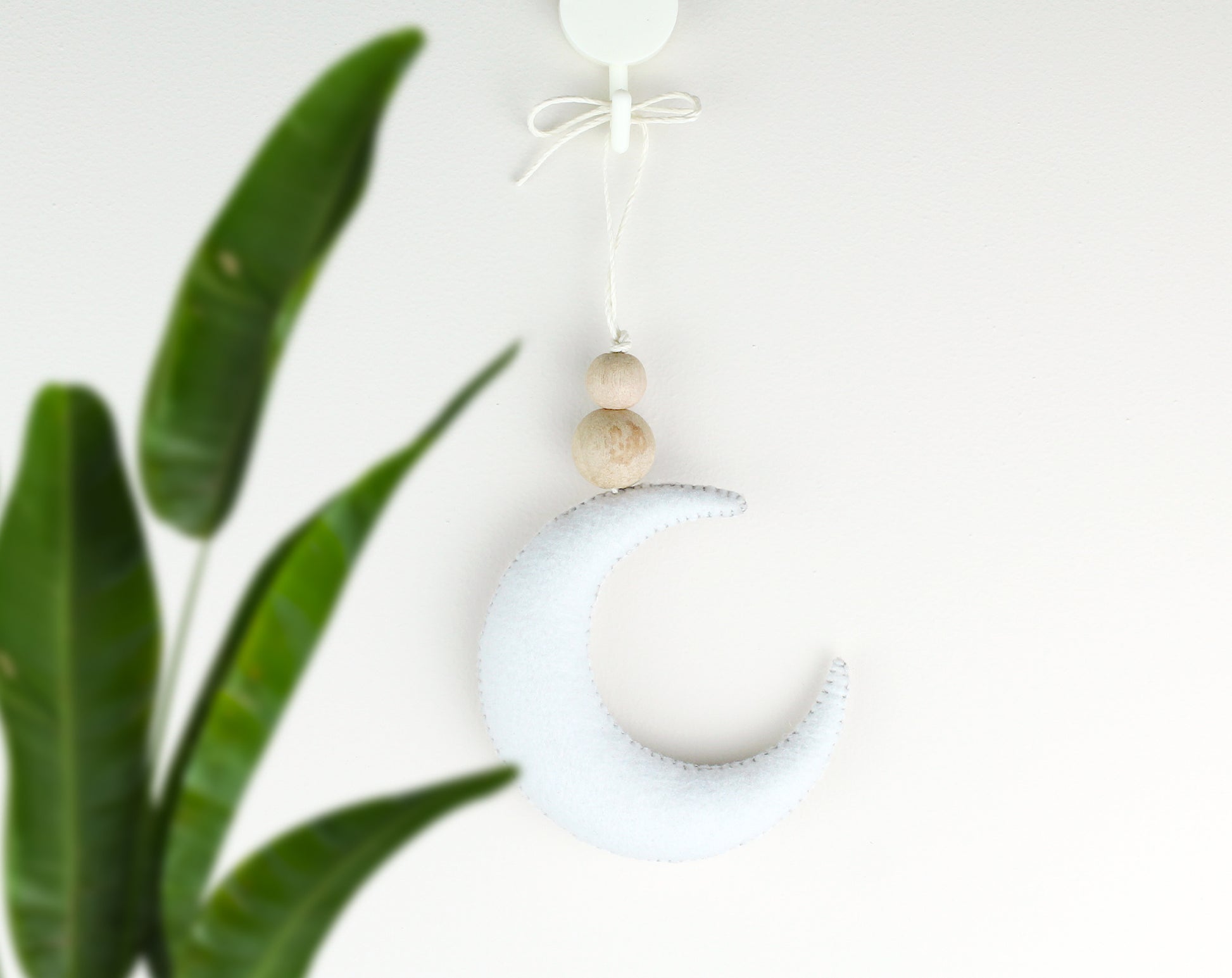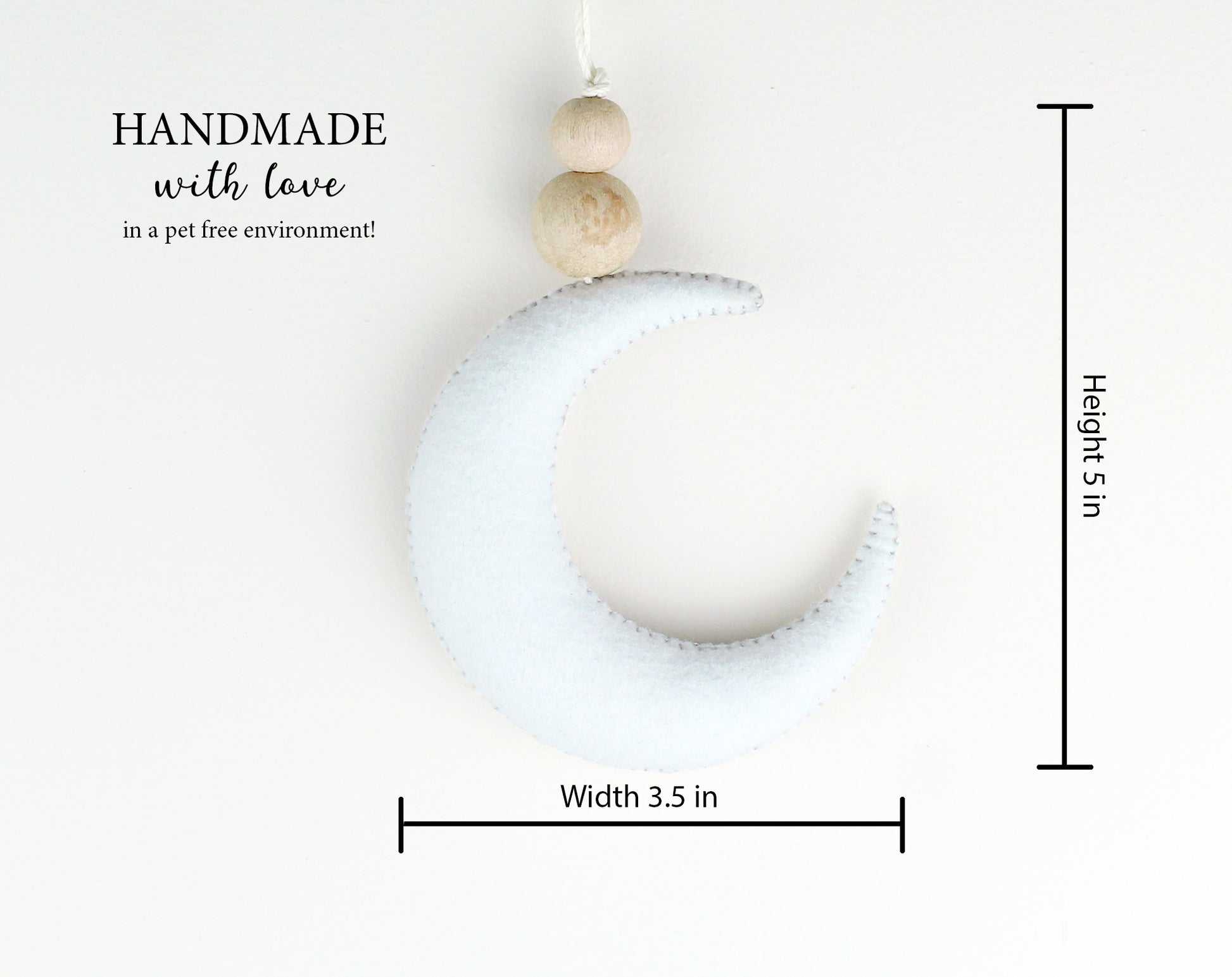 This listing is for one handmade plush moon ornament hanging from a cord. (Wall hook not included). Our handmade moon Ornament is a must-have for any child's nature-inspired room or baby nursery decor. Unleash your child's imagination and keep them busy for hours as they explore our one of a kind, handcrafted felt plush Ornaments, Wall Hangings, Garlands and Baby Mobiles. Each plush stuffed element is lovingly hand cut and hand-switched in a pet-free environment. Then it is filled with hypo-allergenic polyester stuffing and hung from a cord. Made with premium quality felt fabric, it is extremely safe to your baby's touch. Materials: felt, wooden beads, cord, polyester stuffing, embroidery thread and lots of love. Kindly Note: Colors depicted on your screen may be slightly different from the actual product. While we try to accurately display the colors of all our products, the colors you see will depend on your monitor and may not be accurate because of the variations in electronic screen settings (computer/laptop/tablet/smartphones).