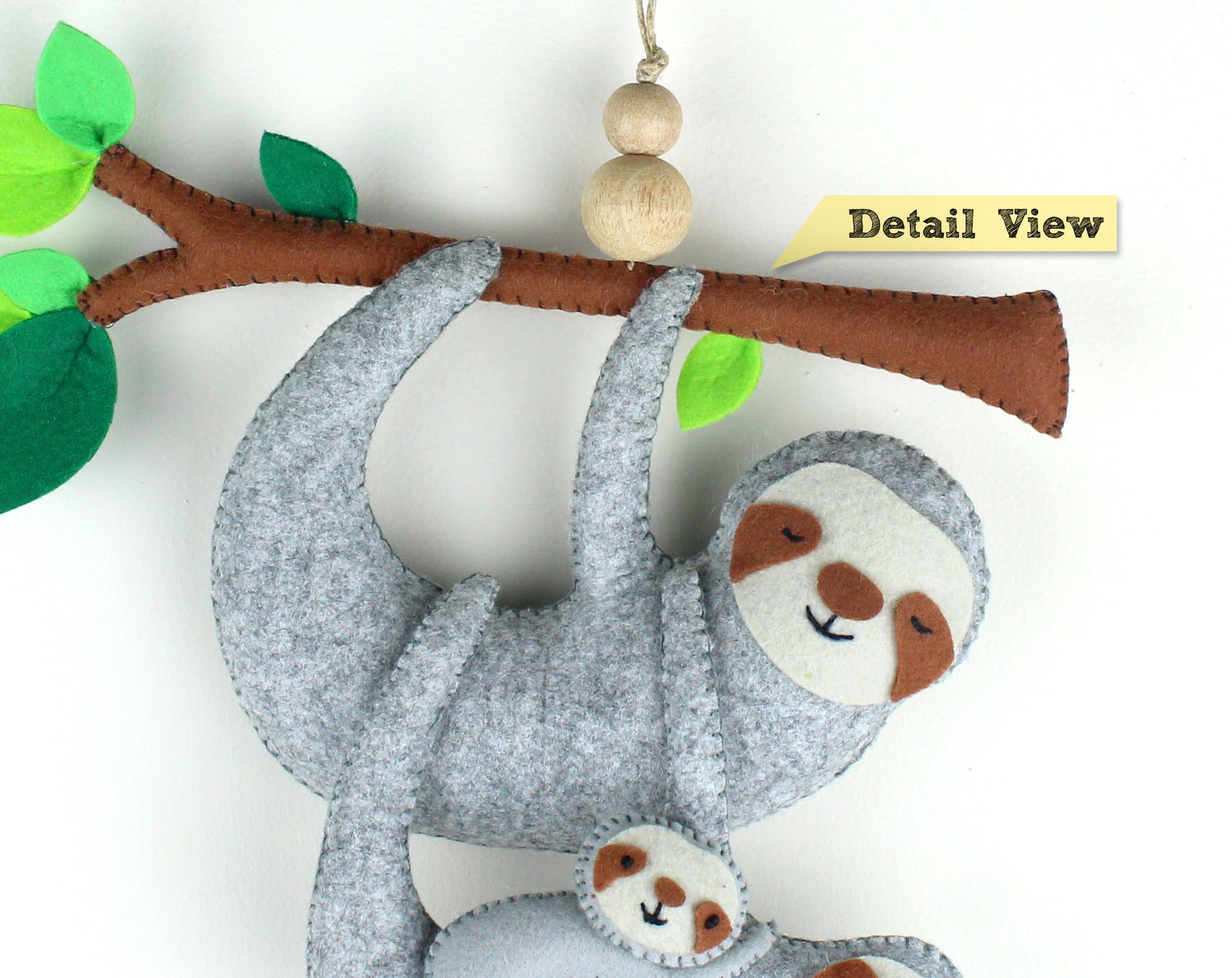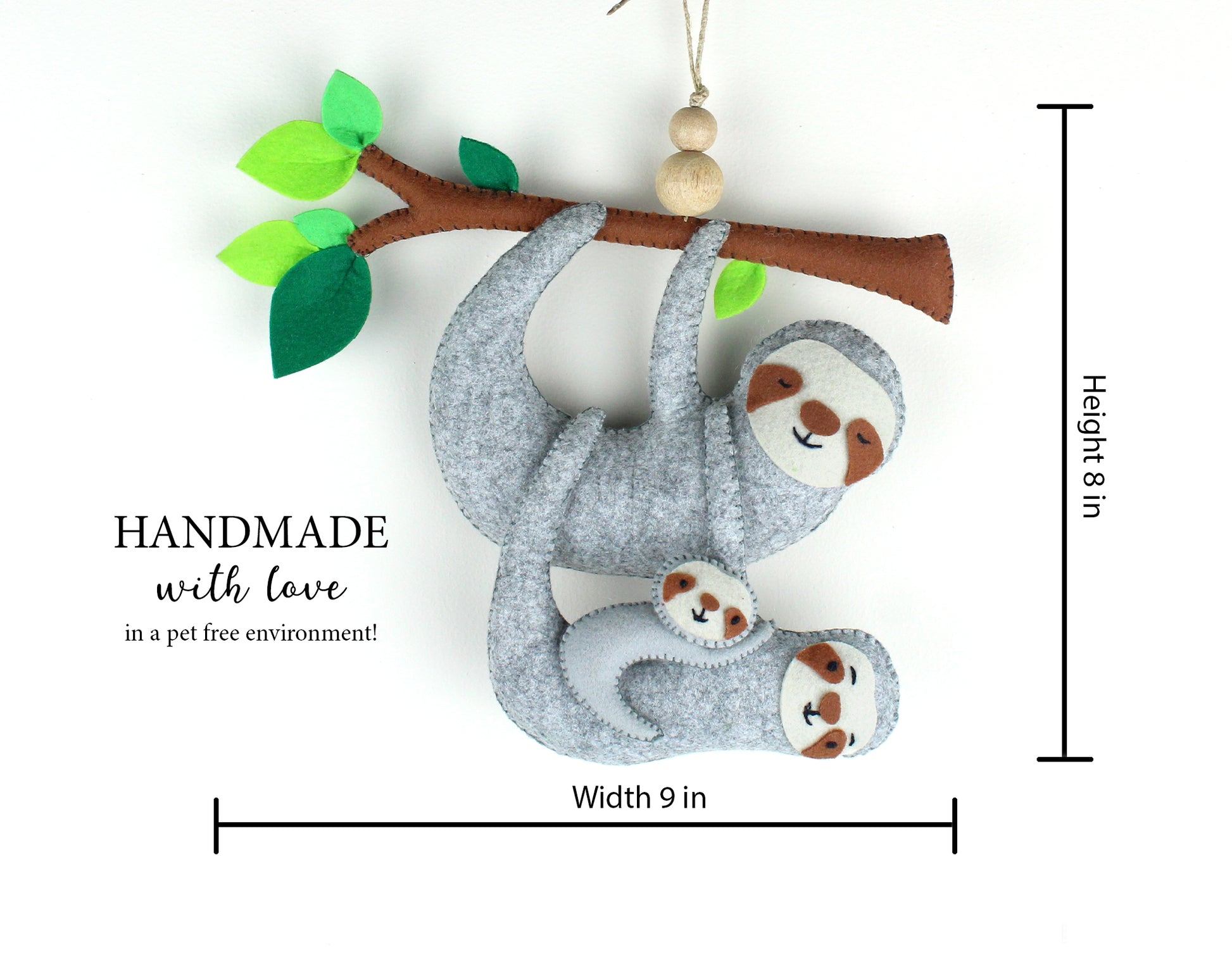 This listing is for a super cute sloth family hanging on a tree branch ornament hanging from a cord. (Wall hook not included). Our handmade Sloth family Ornament is a must-have for any first time parents. Unleash your child's imagination and keep them busy for hours as they explore our one of a kind, handcrafted felt plush Ornaments, Wall Hangings, Garlands and Baby Mobiles. Each plush stuffed element is lovingly hand cut and hand-switched in a pet-free environment. Then it is filled with hypo-allergenic polyester stuffing and hung from a cord. Made with premium quality felt fabric, it is extremely safe to your baby's touch. Materials: felt, wooden beads, cord, polyester stuffing, embroidery thread and lots of love. Kindly Note: Colors depicted on your screen may be slightly different from the actual product. While we try to accurately display the colors of all our products, the colors you see will depend on your monitor and may not be accurate because of the variations in electronic screen settings (computer/laptop/tablet/smartphones).