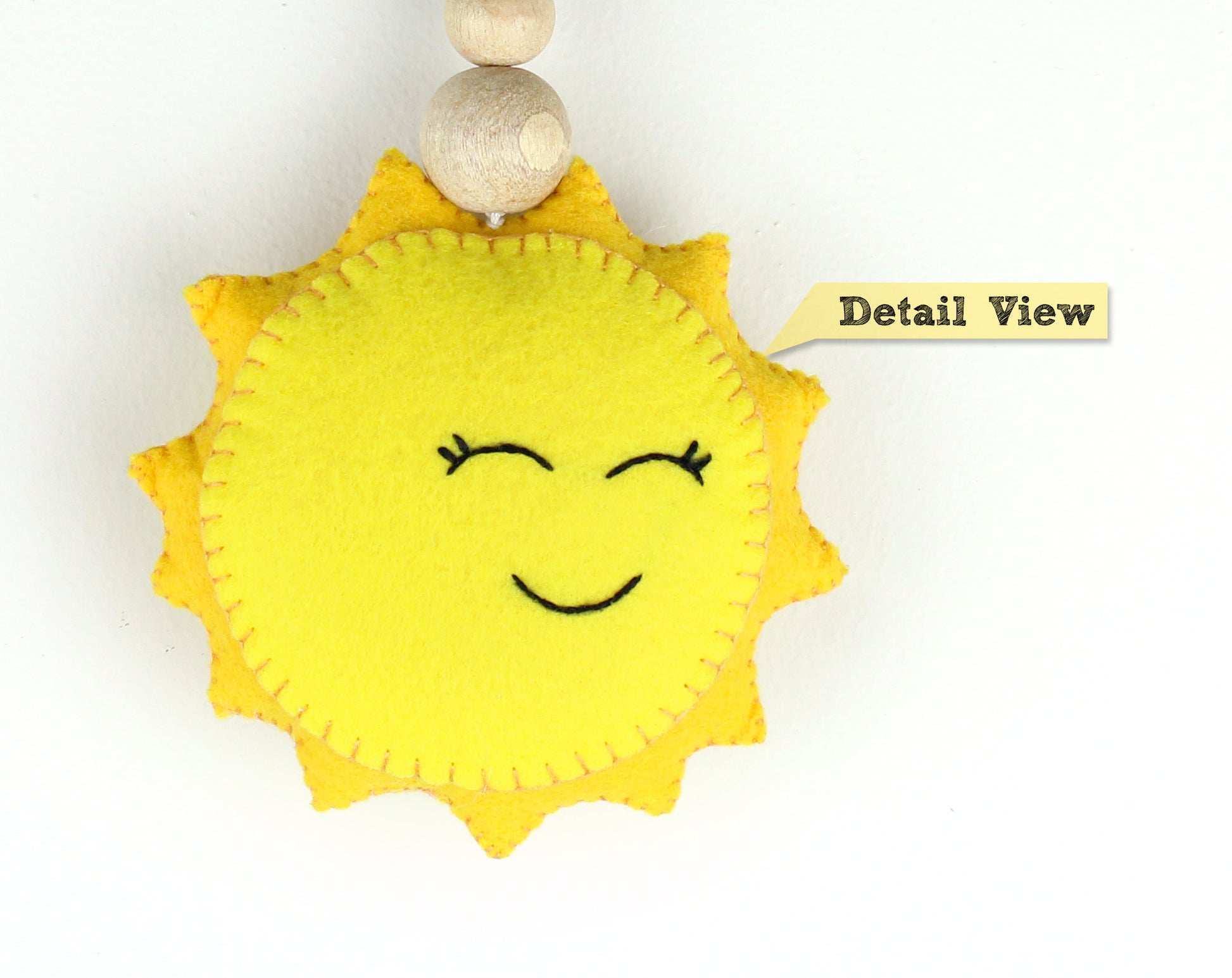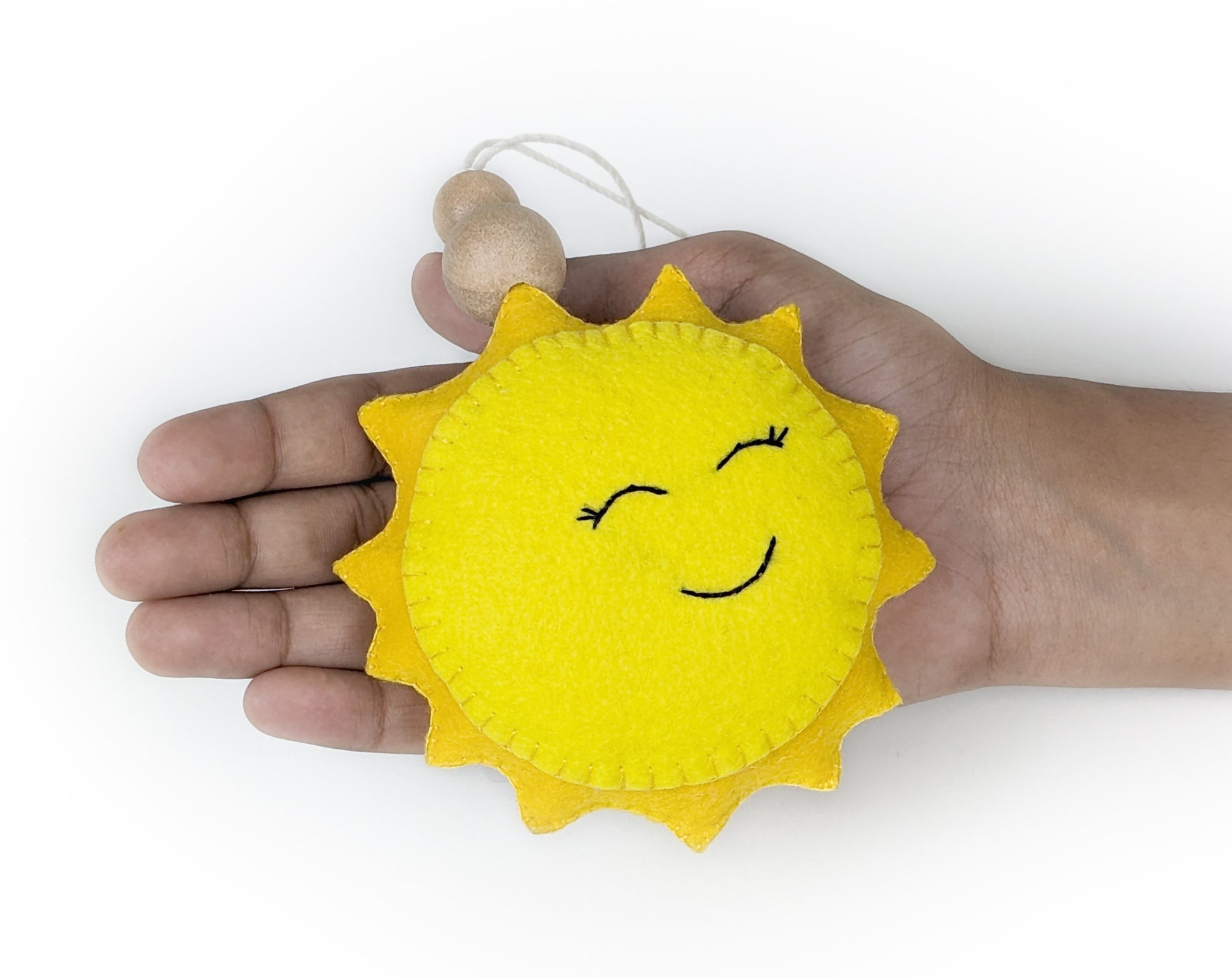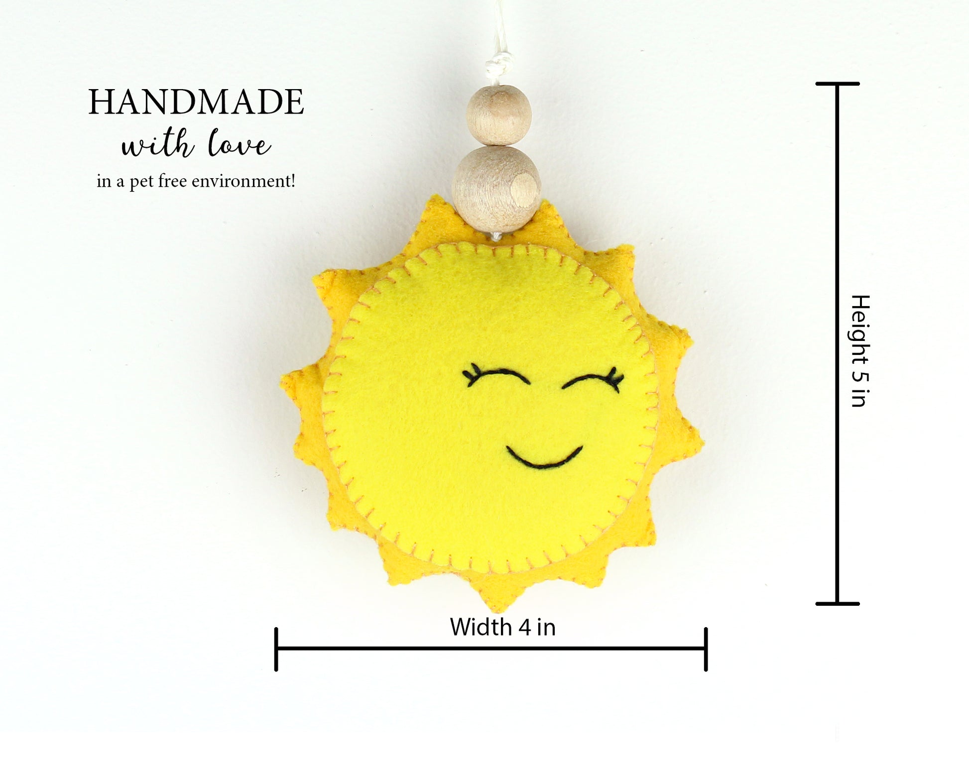 This listing is for one handmade plush Sun ornament hanging from a cord. (Wall hook not included). It is an excellent addition to a nature and space-themed decor. Unleash your child's imagination and keep them busy for hours as they explore our one of a kind, handcrafted felt plush Ornaments, Wall Hangings, Garlands and Baby Mobiles. Each plush stuffed element is lovingly hand cut and hand-switched in a pet-free environment. Then it is filled with hypo-allergenic polyester stuffing and hung from a cord. Made with premium quality felt fabric, it is extremely safe to your baby's touch. Materials: felt, wooden beads, cord, polyester stuffing, embroidery thread and lots of love. Kindly Note: Colors depicted on your screen may be slightly different from the actual product. While we try to accurately display the colors of all our products, the colors you see will depend on your monitor and may not be accurate because of the variations in electronic screen settings (computer/laptop/tablet/smartphones).