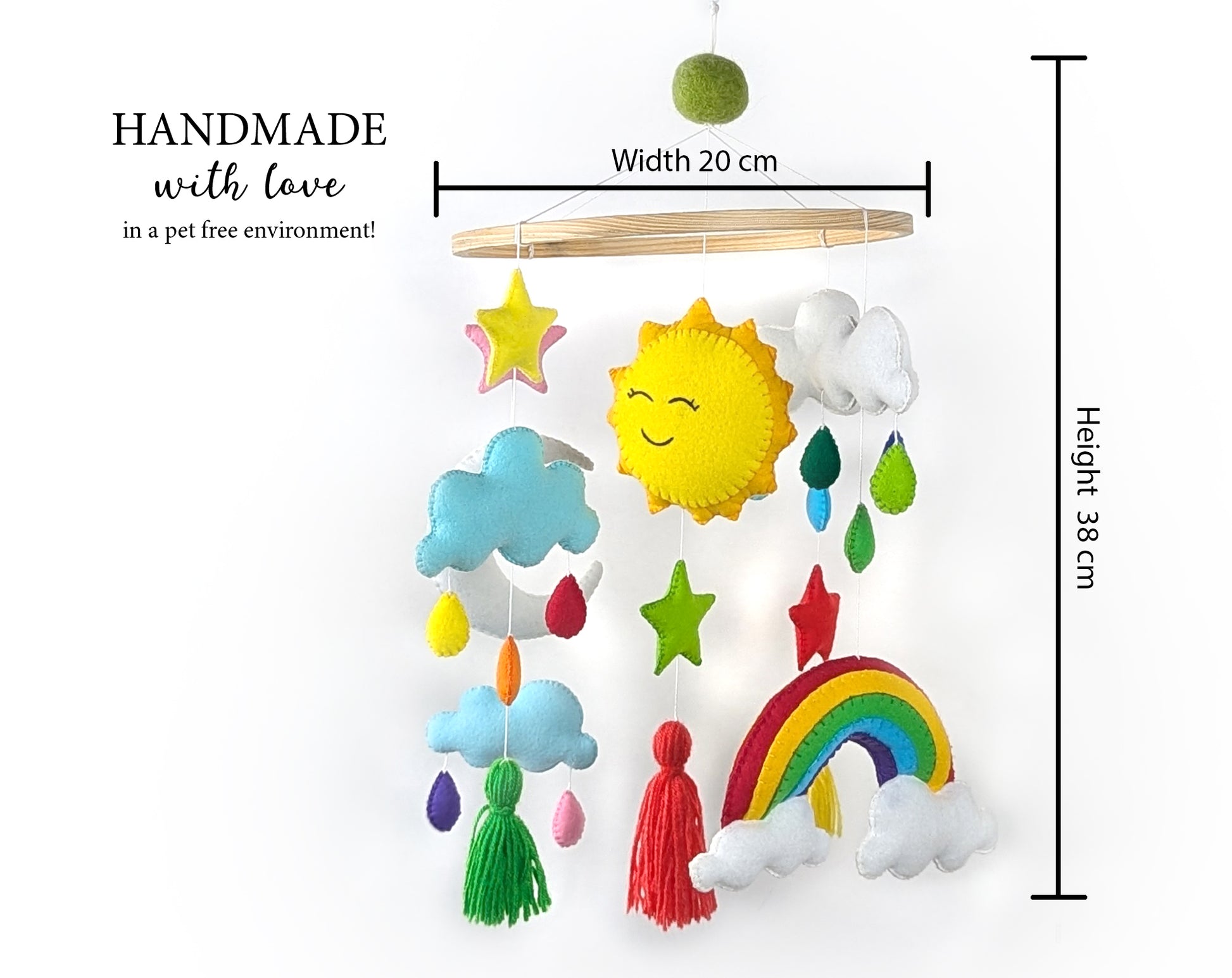Each plush stuffed element is lovingly hand cut and hand-switched in a pet-free environment. Then it is filled with hypo-allergenic polyester stuffing and hung from a ribbon. Made with premium quality felt fabric, it is extremely safe to your baby's touch. Materials: felt, pinewood stand, wooden beads, cord, polyester stuffing, embroidery thread and lots of love.