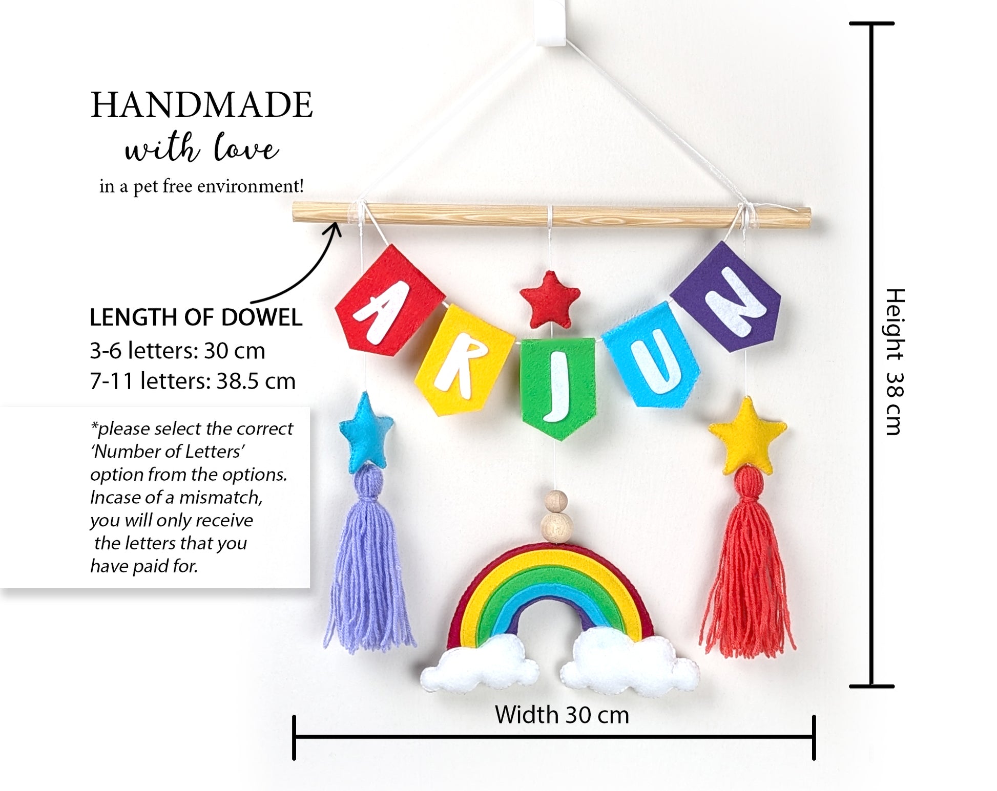 - DIMENSIONS: Wooden dowel measures approximately 30 cm in length for 3-6 letters and 38.5cm for 7-11 letters, with name pennants and rainbow decoration hanging below.